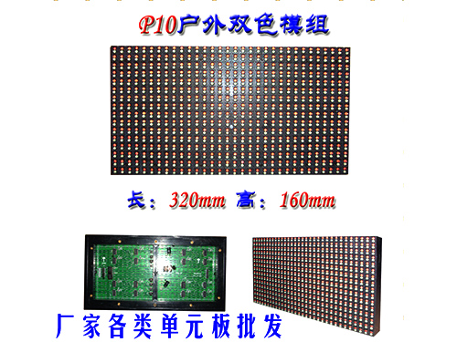 户外P10双色直插单元板主要是红色和绿色LED晶片封装为一个像素点后组成的像素,再固定到塑胶套件而成。